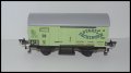 gedeckter Güterwagen, 2-achsig, Wagenkasten aus geprägtem Blech, hellgrün, Wagendach aus Blech grau, abnehmbar.