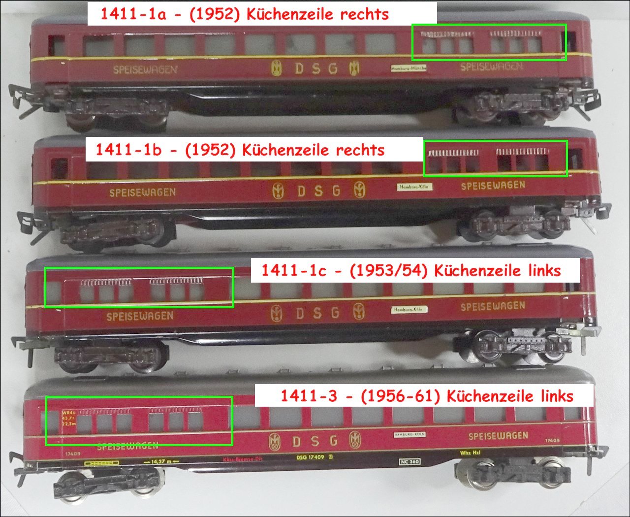 1411-2a (1953/54) | dito, jedoch braune Drehgestelle mit Spitzachslagerung, mit Stempelung B 4/3 , 12/3 etc. und 1954 dann "B 4/4". Dach stärker silber gespritzt als bei 1411-1b. Frühere Varianten sind noch mit grosser Kupplung 1, danach ab Mitte 1953 (Stempelung 12/3) mit kleiner Bügelkupplung 2. Küchenzeile in Fahrtrichtung links. | 40,-- |