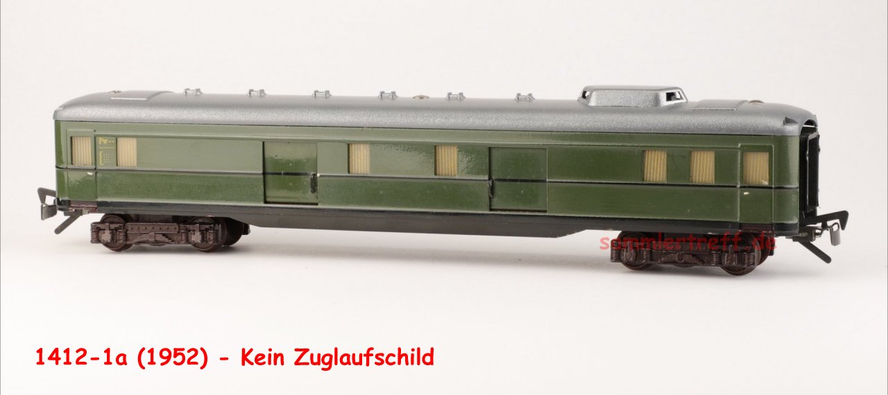 1412-3b (1955) | wie 1412-3, also Dach ohne Dachlüfter, schwarze Drehgestelle, Wagenboden schwarz. Zuglaufschild Hamburg-Köln erhaben. Stempelung i.d.R. "C 4/5". Diese Ausführung wird sehr selten einmal angeboten, daher etwas erhöhter Marktpreis. | 40,-- |