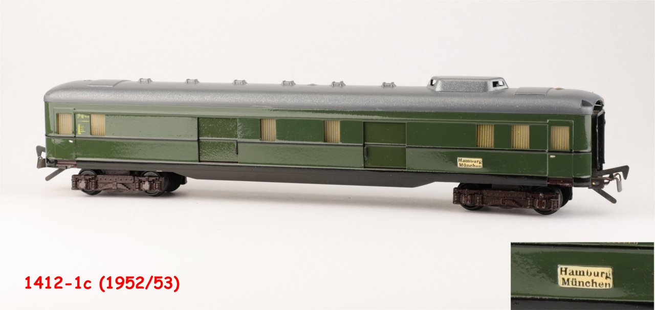 1412-4a (1956) 1412-4b (1956-60/61) | Wagenkasten chromlithografiert und realistischere lesbare Beschriftung, auch im Bereich der schwarzen Schürze. Zuglaufschild immer "Hamburg-Köln" flach. Wagenboden ist schwarz lackiert, Dach ab 1958 hellgrau durchfärbter Kunststoff, dunkelsilber gespritzt. Trägermaterial scheint selbst bei geringer Nutzung speziell an den Dachenden häufig durch. Verschiedene Nuancen in der Farbgebung sind über den Produktionszeitraum bekannt: Die Modelle von 1956 sind eher blaugrün (1412-4a), ab 1957 dunkelgrün glänzend (1412-4b). Sehr häufig vorkommend, geringer Sammlerwert. Auch die Bedruckung des Heimatbahnhofs ist einmal zentriert, einmal linksbündig. | 10,-- |