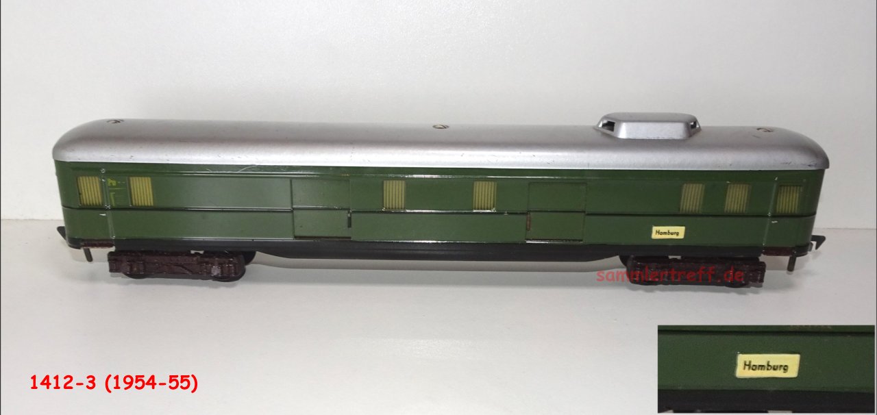 1412-3 (1954/55) | wie 1412-2, aber Dach ohne Dachlüfter. Anfangs noch (wie abgebildet) braune Drehgestelle, ab Stempelung "B4/4" sind dann aber auch schon schwarze Drehgestelle möglich, Dach auch an den Rändern nun komplett silber lackiert. Zuglaufschild "Hamburg". Ab 1955 auch mit Wagenboden schwarz, Stempelung i.d.R. "C 2/5", und auch mit Innenbeleuchtung und Metallrädern ausgeliefert. (1412-J) | 25,-- |