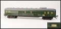 1412-1a (1952) | Dach mit 6 Dachlüftern, kein Zuglaufschild erhaben vorhanden". Wagenboden und Drehgestellblenden komplett braun mit zapfengelagerten braunen Kunststoffrädern. Am Wagenboden erhaben "Fleischmann Made in US Zone Germany", keine Stempelung. Die seltenste Ausführung des Packwagens. Originalkarton stehend. Dunkelgrau durchgefärbtes Dach ist nur dünn silber gespritzt, d.h. an den Rändern ist das dunkle Trägermaterial sichtbar. Wagen glänzendgrün lackiert, Zierlinie und Schürze schwarz (handbemalt) | 150,-- |