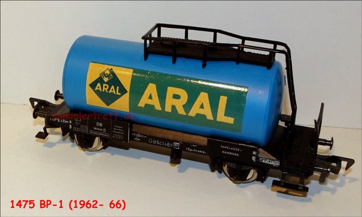 1475BV-1 (1962-65/66) | Wagenboden Metall, Beschriftung am Rahmen erhaben ausgeführt und weiß hervorgehoben. Seitliche Tafeln an den Kesselstühlen aus Metall, beschriftung aufgedruckt. Kessel blau mit weißer "ARAL" Beschriftung als Schiebebild aufgebracht | € 15,-- |