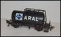Hier abgebildet ist ein ungebauter kompletter Bausatz des Kesselwagens 1475 B - deutlich sichtbar, dass hier der Kessel unlackiert schwarz beigelegt war und die linke Stirnseite des Kessels erst noch mit Plastikkleber angebracht werden müsste. Zusätzlich musste die gewünschte Mineralölgesellschaft am Kessel als mitgelieferte Aufkleber selbständig angebracht werden. Natürlich müsste auch noch das Unterteil montiert und die erhabene Beschriftung weiß hervorgehoben werden. Letzteres ist bei den meisten montierten Bausatzwagen ebenfalls unterlassen worden. (Klicken Sie auf das Bild, um eine vergrößerte Ansicht zu bekommen.)Ein sauber gebautes Bausatzmodell des 1475 B könnte beispielsweise als "ARAL" Kesselwagen so aussehen wie auf dem Bild abgebildet und wäre trotzdem kaum für €10,-- zu erwerben, ungebaut müsste etwa €25,-- veranschlagt werden. Wenn Sie also einen Kesselwagen mit schwarzen Kessel sehen handelt es sich niemals um ein von Fleischmann produziertes Fertigmodell sondern immer um ein Bausatzmodell.