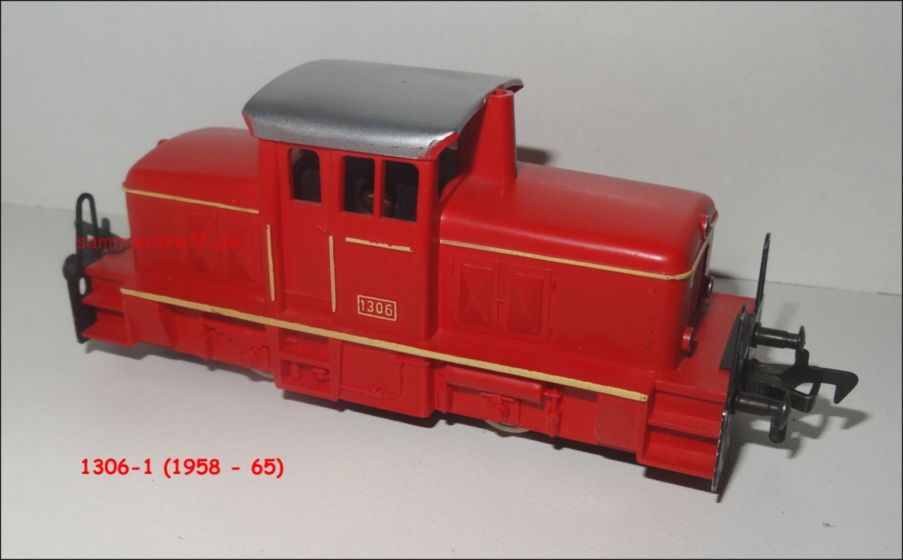 1306-1 (1959-65/66) | Erhabene Aufschrift "1306" und "O&K" an einer der Stirnseiten. Puffer sind eingeschraubt, Pufferbohle Blech und umgebogen, Schienenräumer Blech. Dach silber lackiert. | € 25,-- |