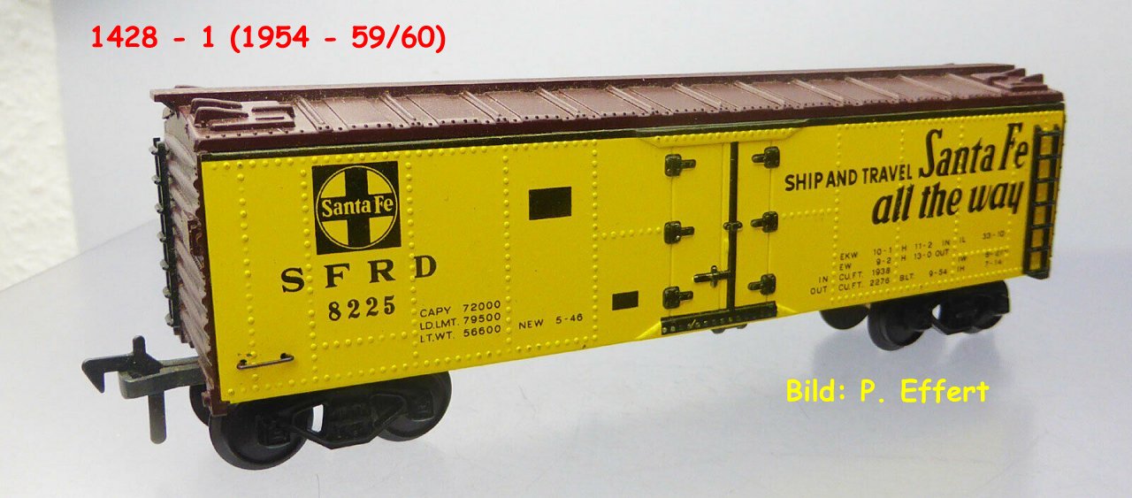 Anfänglich war der Wagenaufbau mit Stirnseiten und Dach aus Kunststoff braun, die Seitenwangen aber Blech mit geprägten Drehtüren. Bis ca. 1963 waren die Leitern an den Stirn- und Seitenwänden, sowie an einer Stirnseite auch noch ein Bremsrad, aufgesetzt aus bruchempfindlichen schwarzem Kunststoff. Ab 1964 dann waren die Leitern gedruckt bzw. an den Stirnseiten erhaben angespritzt ausgeführt. Ab ca. 1965 wurden die Seitenwangen ebenfalls aus Kunststoff gefertigt und die Trittleitern waren dann ebenfalls erhaben ausgeführt - dabei wurde nun derselbe Wagenaufbau aus Vollkunststoff mit beweglichen Schiebetüren wie bei Kat.-Nr. 1427 benutzt.