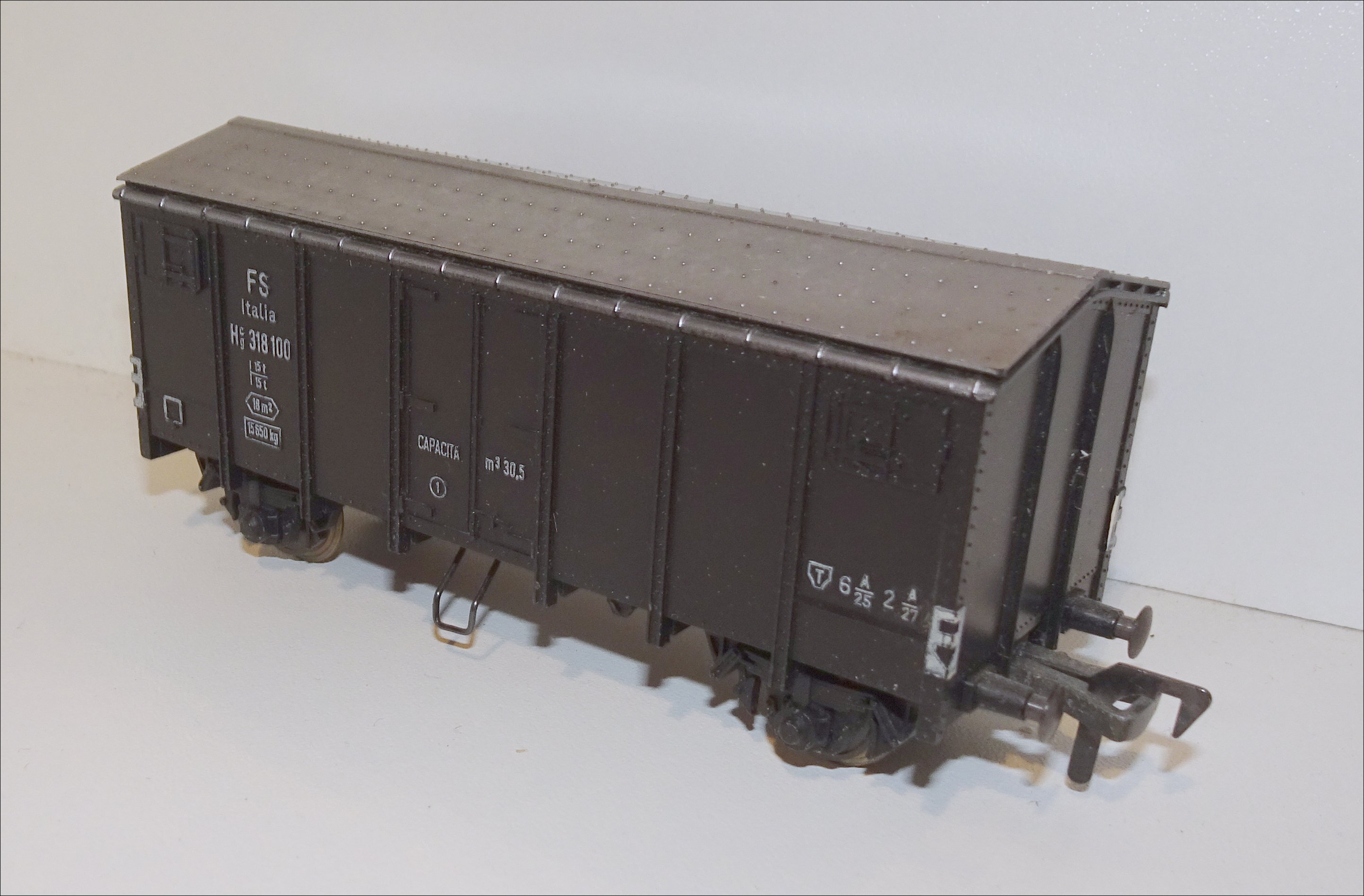 Kühlwagen der italienischen Staatsbahn FS, 2-achsig, Untergestell Metall, Wagenkasten Kunststoff schwarz mit Spitzdach. Aufschrift "FS", "Italia", "Hcg 318 100" erhaben weiß ausgeführt. Häufig vorkommende Variante, geringer Marktwert. Länge: 120mm.