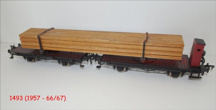 1493 (1957-66/67) | Die Versionen unterscheiden sich nur im Detail am Bremserhaus - anfänglich am Wagenboden mit 2 Kunststoffzapfen durch warme Umformung (ca. 1954 - 56), danach am Bühnengeländer mit Metallklammer befestigt. Über die Bauzeit erst Kupplung mit Horn, danach ab ca. 1961 ohne Horn. | €15,-- |